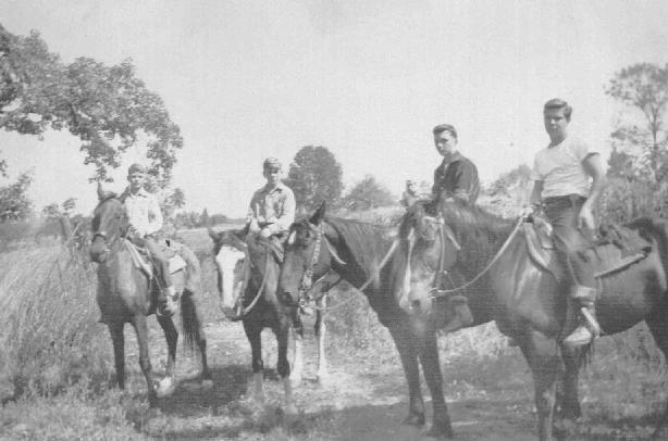 Previous Page Cooney's Riding Acadmey was a popular spot for riding horses in the early fifties. These four cowpokes look to be pausing for just a moment, just to freshen up the horses, before they gallop off again. Pictured here are L. to R. Bob Keyser, Albie Booth, my brother John Winchester and Robert Morse. ... from Previous Page Click to zoom in to larger photo |