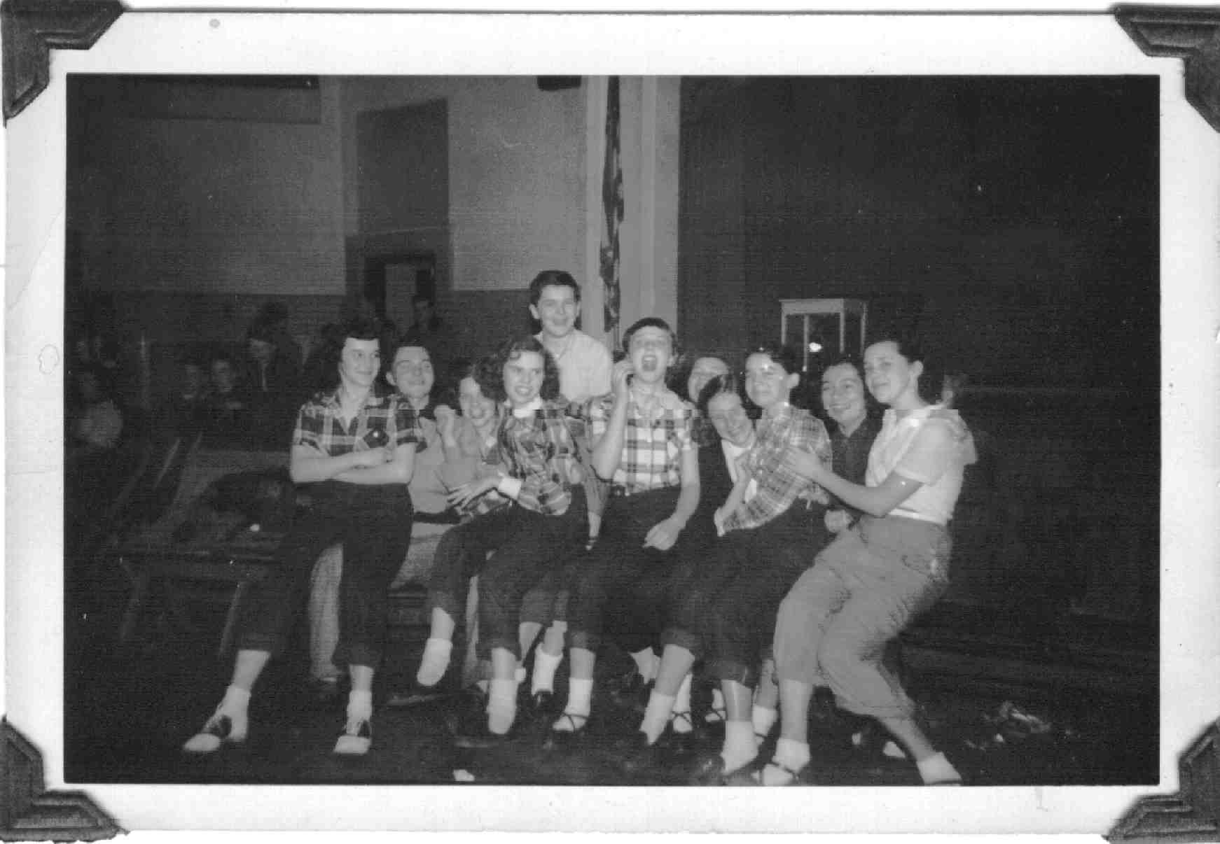 Previous Page To see Comments, click below: by   Liz   Feagles Brown - "This had to be after a game ..." Some of my happiest moments were spent in the high school gym.       Everything happened there.       Not only basketball games, but dances, plays, and since there was no cafeteria, lunch hours too, often found us in the gym, especially on cold or rainy days.       After basketball games, kids hung around waiting for friends and rides. This picture captures so well one such carefree and happy moment in the WHS gym after a basketball game. In this case, I was the little kid with a camera. The gleeful subjects are: L. to R.: Myra McLure, John Winchester, Dot Schlagel,, Shirley Frey, Walt White, Liz Feagles, Gloria Ryerson, Marylin Ringrose, Jane Kintz, Judy Stidworthy, Dorothy Buss.       Those were the days! ... from Previous Page Click to zoom in to larger photo |
