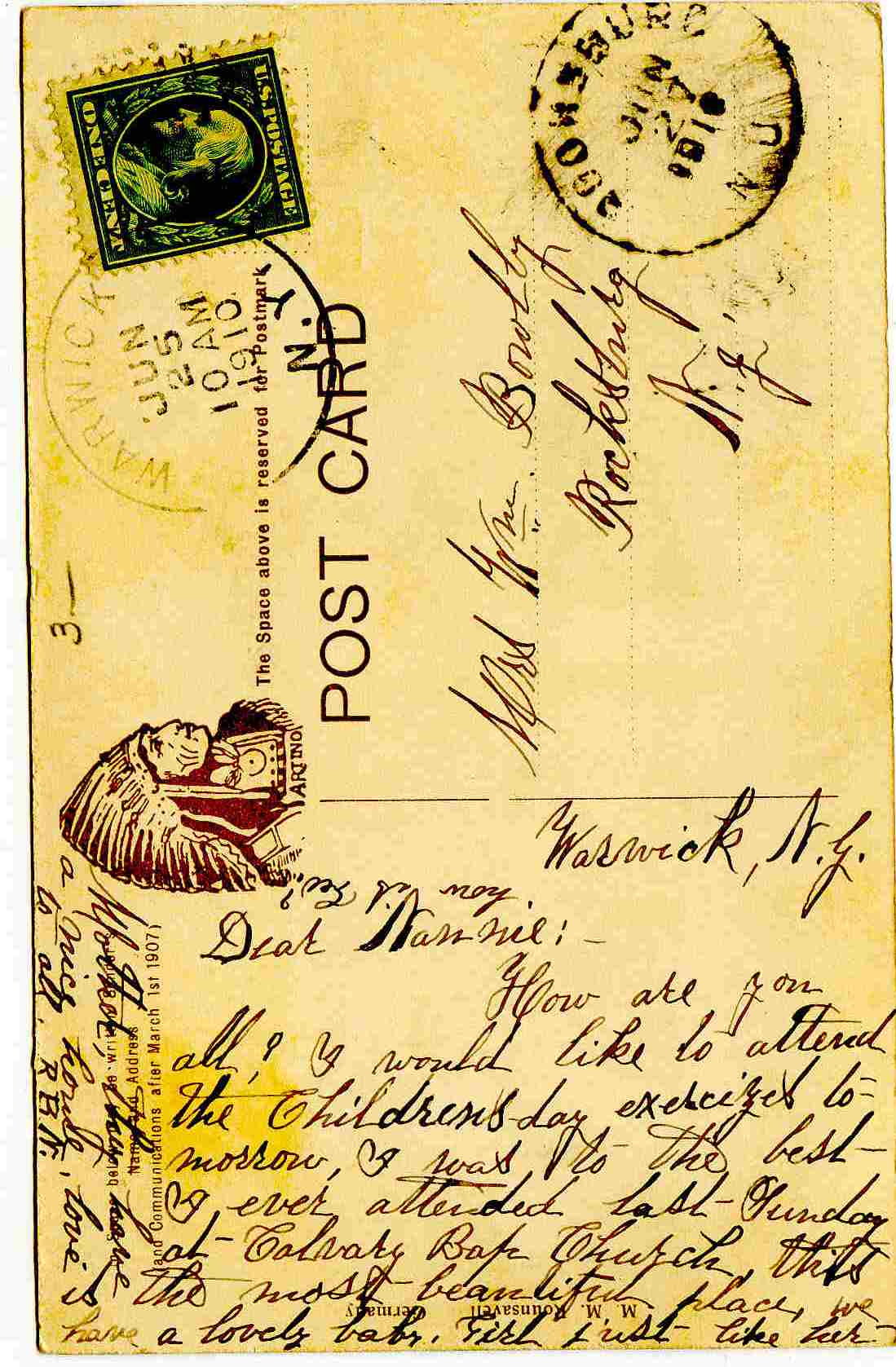 Previous Page Dear ____ How are you all? I would like to attend the Children's day exercises tomorrow, I was to the best I ever attended last Thursday at Calvery Bap. Church. This is the most beautiful place, we have a lovely baby girl just like her Mother. They have a nice home. Love to all. R.A.M. ... from Previous Page Click to zoom in to larger photo |