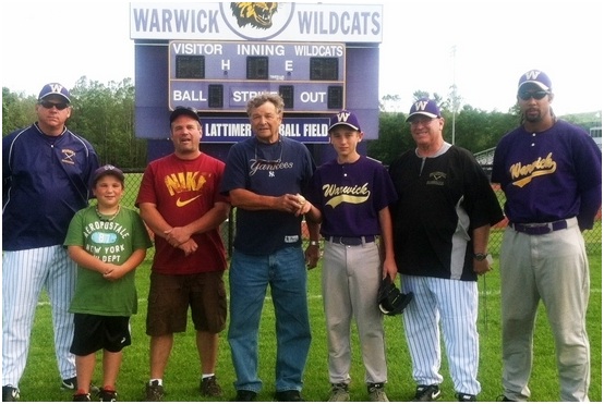 Previous Page from WARWICK ADVERTISER — Baseball has been a passion for the Scotto family, starting with Bruce Scotto who moved to Warwick with his parents in the 1940’s. Three generations of his family have followed since then, including Class of 1985 standout pitcher Chris Scotto, Dan Scotto and many grandchildren whom all have a passion for baseball. It begins, though, with Bruce Scotto, class of 1958, who threw one of possibly only two perfect games in the history of Wildcat baseball. On May 3, 1957, 21 batters from Highland Falls got up to bat against Scotto. Twenty-one batters sat down. No hits, no walks, no base runners in the Wildcats’ 7-0 victory. Also on Coach Vince DeRosa’s roster that day were Gene Scheuermann (third base), David Morgan (second base), Don Bainbridge (short stop), Bruce Bell (catcher), Frank Fotino and Melvin Langlitz (first base) and outfielders Ed Winchester, Art Houghtaling and Joe Green to name a few. Fifty-five years later, almost to the day, Nick Scotto, son of Wildcat baseball standout Dan Scotto (Class of 1982) and grandson of Bruce Scotto, took the ball. Wearing the Wildcat purple and gold of the Wildcats modified baseball team he nearly matched his grandfather’s accomplishment. Through four innings this past May 1, Nick was perfect against Middletown Monhagen. Late in the fifth, however, he gave up a hit. No matter, the Wildcats would cruise to a 15–0 victory behind young Scotto’s pitching. (Coincidentally, Nick Scotto has some baseball genes from his mother’s side of the family as well: Her cousin plays baseball for the New York Yankees and wears number 2.) The baseball from Bruce Scotto’s perfect game can be seen in the Hallway of Champions in the display case outside the High School new gym, along with many other great pictures linking the generations of Wildcat ballplayers. ... from Greg Sirico Previous Page Click to zoom in to larger photo |