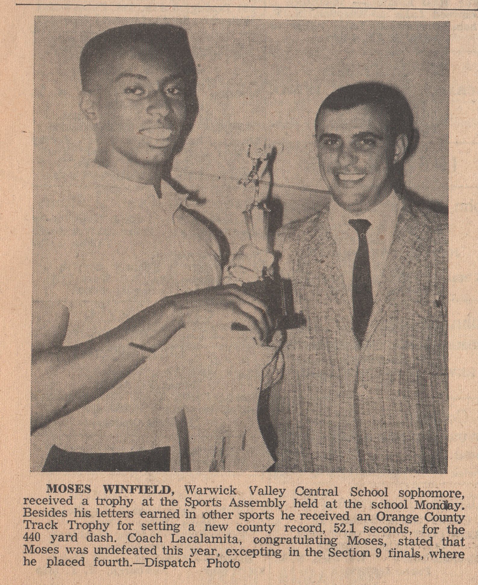Previous Page Moses was a stellar athlete in track and football at WHS in the early 1960s, as this photo indicates, a county champion as a Sophomore. I wonder about his “career” and life after Warwick. He seemed destined for good things, athletically and otherwise. I hope that he found much success. ... from Dispatch Photo 1961 Previous Page Click to zoom in to larger photo |