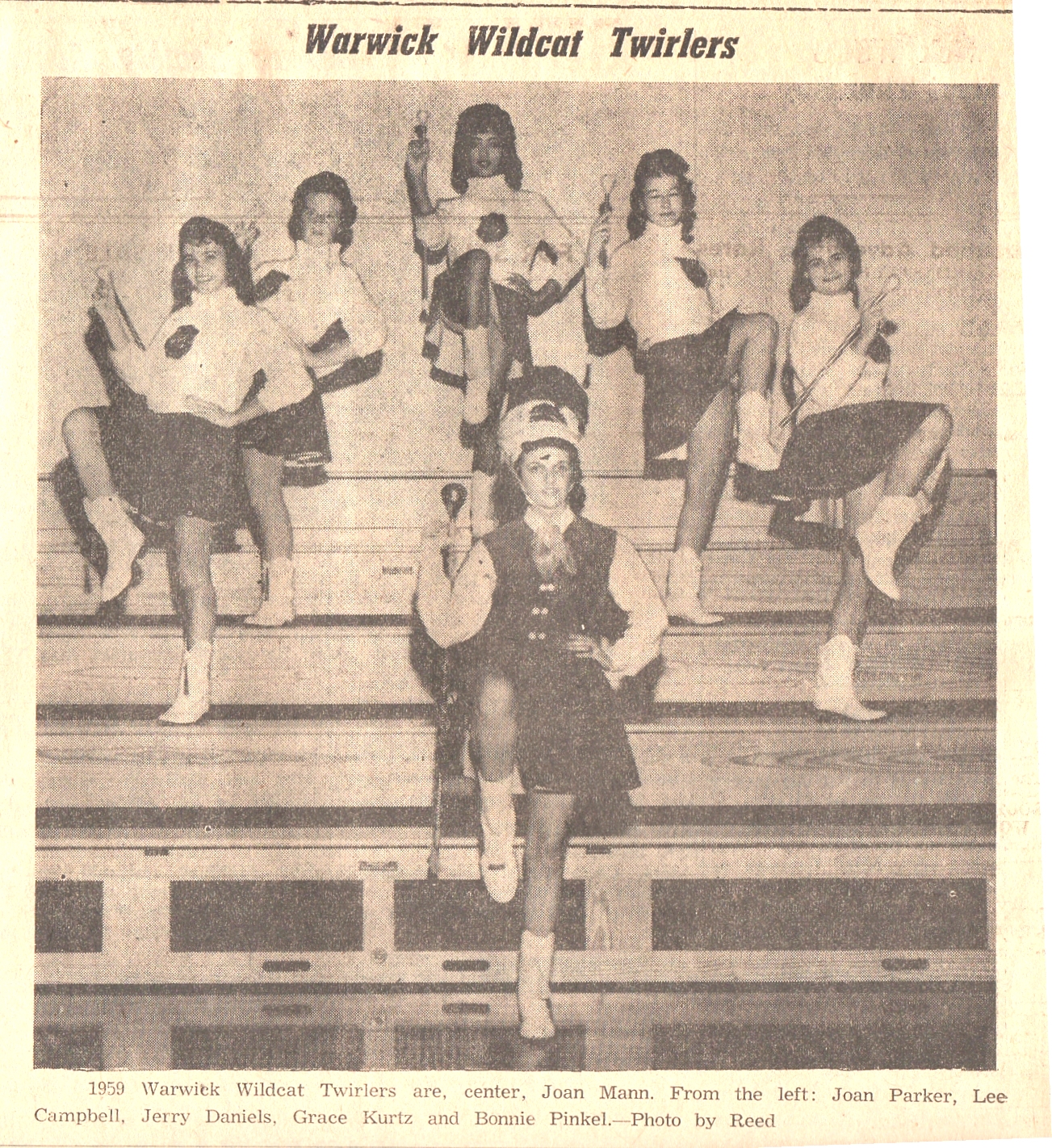 Previous Page ![]() To see Comments, click below: by     Pat Campbell - "It is great to see the picture" by     Ed Winchester - "Hi Pat, I remember you Campbel" The 1959 version of the WHS Majorettes, led by Joan Mann. I think technically it's one majorette (Joan), and five twirlers - Joanie Parker, Lee Campbell, Jerry Daniels, Grace Kurtz and Bonnie Pinkel. Regardless, all beautiful, as was the tradition with WHS majorette/twirler teams. This picture appeared in the Warwick Dispatch, November 1959. ... from Dispatch Photo Previous Page ![]() Click to zoom in to larger photo |