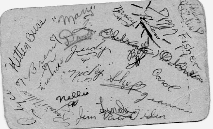 Previous Page Back of Doris Atton's 1950s Go Card - Names I see: Kitten Buss, Mary, Roger Miller, Jim Van Orden, Nellie (Ames?), Francis (Fotino?), Judy & Nicky, Shep (Blackman?) Helen, Carol, Linda, Nancy - prominent teens all - even famous! ... from Doris Atton Humphrey Previous Page Click to zoom in to larger photo |