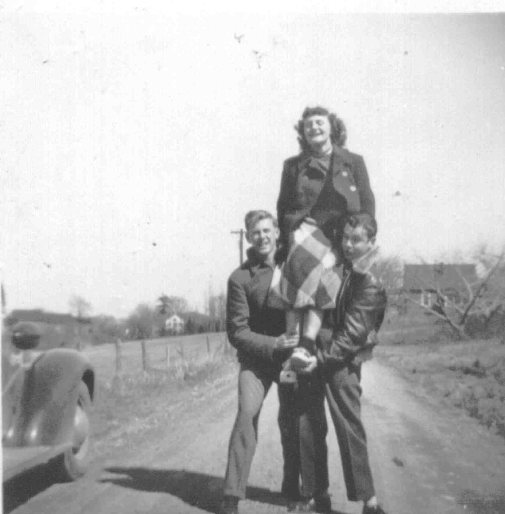 Previous Page Chickie Heiblim says that this picture was taken on a school lunch hour, "when a few of us went for a ride. The year was 1949" That's Nelson "Mansy" Scheuermann and Harold "Schoie" Schofield hoisting Janet Paffenroth (Milt's sister).     Where was this taken? Doesn't that country road look familiar? But I can't place it. ![]() Inscription reads: Janet Schoie Mansy March '49 I don't know about you but thinking back to a day such as this - chilly yet with a bright sun that promised a soon coming Spring to the Warwick Valley, .. a school day lunch hour, .. and we the upperclass school kids, kings and queens of the known world, ..piling into a car at noon time, riding around the country, taking pictures and laughing .. Oh so much laughing. ... from Chickie Heiblim Previous Page Click to zoom in to larger photo |