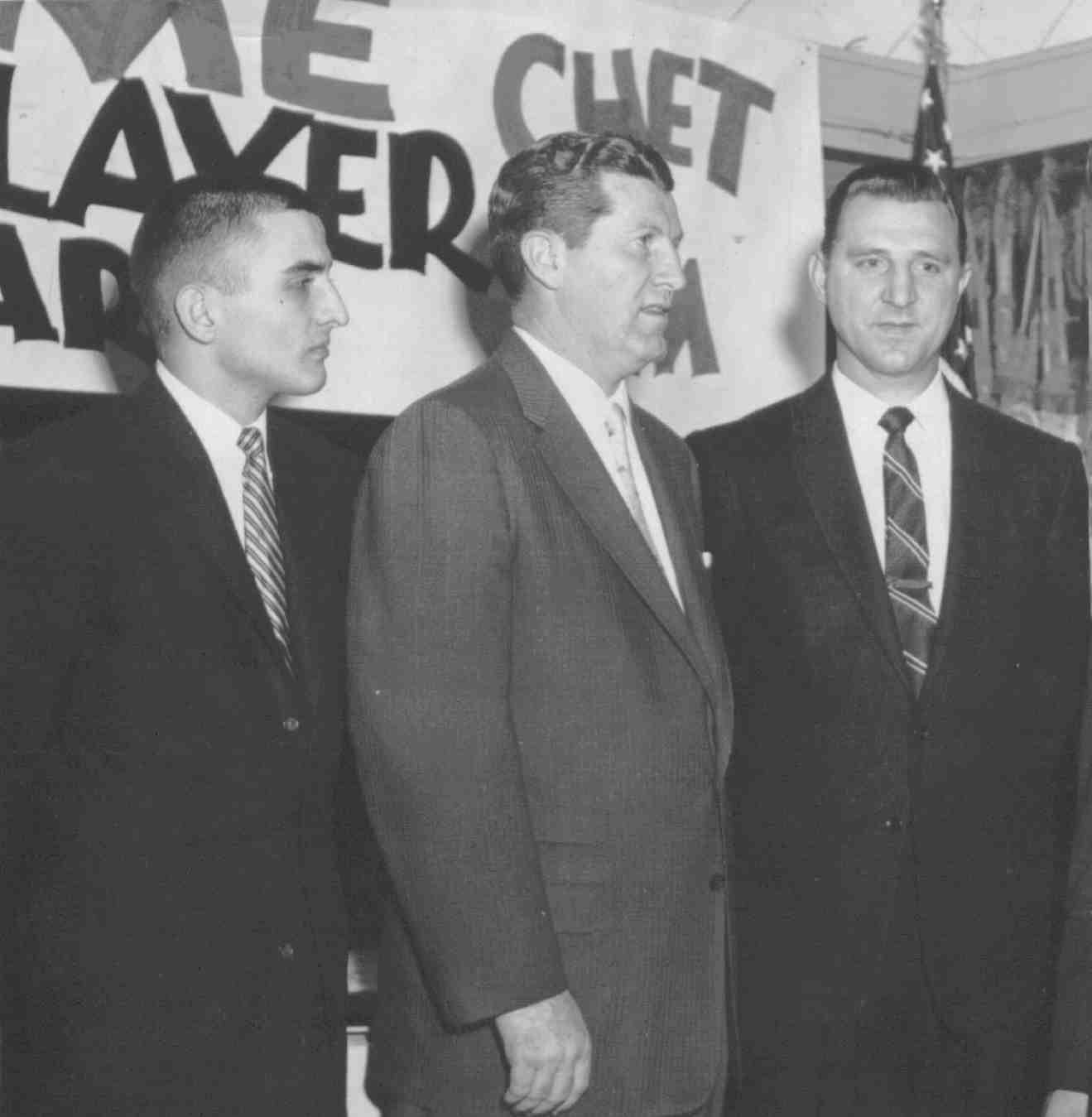 Previous Page Eventually I hope to get some more candid photos of this most respected and influential Warwick teacher, coach and friend. For now this will have to suffice.     Vito Magdelinskas is pictured here with fellow Coach of the Year, Frank Mcguire of NC State and NCAA Player of the Year Chet Forte. The photo was taken at a dinner at the Hotel Newburgh in 1958.     Vito was a Basketball coach without peer, in the fifties and beyond. His manner, skill and obvious care for his young charges was a blessing to all Warwick youth of the day, athlete or otherwise.     Picture this - a dozen or so skinny kids in purple cotton shorts, Converse sneakers and plain white tee-shirts scurrying about the old WHS gym. Say it is around 5 O'Clock, mid-December, and the shrill voices of the cheerleaders practicing in the nearby hallway can be heard in the background. In the foreground the boys in short pants hear only the words of their coach, instructing, directing, coaxing, all in a manner befitting of this, the absolute most important pursuit on earth in this December of 1957 - what we called OCL high school basketball. Now, take those dozen boys, add the cheerleaders, the two or three little kids on the sidelines and ask each if there was ever a happier spot in the known universe?     My answer? None even close. ... from Previous Page Click to zoom in to larger photo |